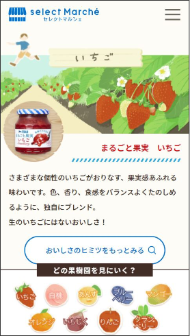 ①ジャムをはじめとする商品を通して、新しいフルーツの魅力や楽しみ方を提案します。 ②フルーツをより身近に楽しんでもらえるよう、「担当者おすすめ!『まるごと果実』でつくるレシピ6選」などのレシピ特集を掲載します。 ③果実園をめぐりながら、フルーツのことを楽しく学べるコンテンツを掲載します。④「フルーティーマルシェ」限定の商品を順次発売していきます。