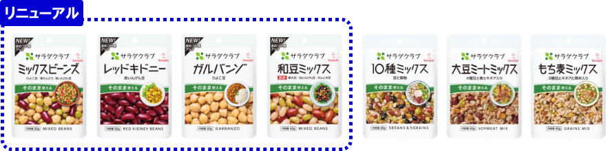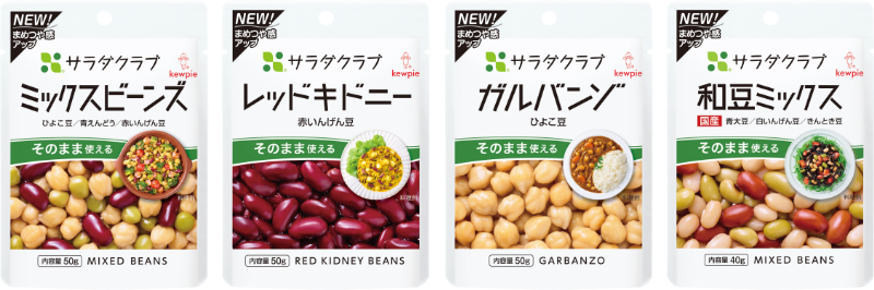 キユーピー株式会社(本社:東京都渋谷区、代表取締役 社長執行役員:長南 収、以下キユーピー)は、「サラダクラブ 素材パウチ」シリーズから、「ミックスビーンズ ひよこ豆/青えんどう/赤いんげん豆」「レッドキドニー(赤いんげん豆)」「ガルバンゾ(ひよこ豆)」「和豆ミックス(国産) 青大豆/白いんげん豆/きんとき豆」の豆類4品をリニューアルします。