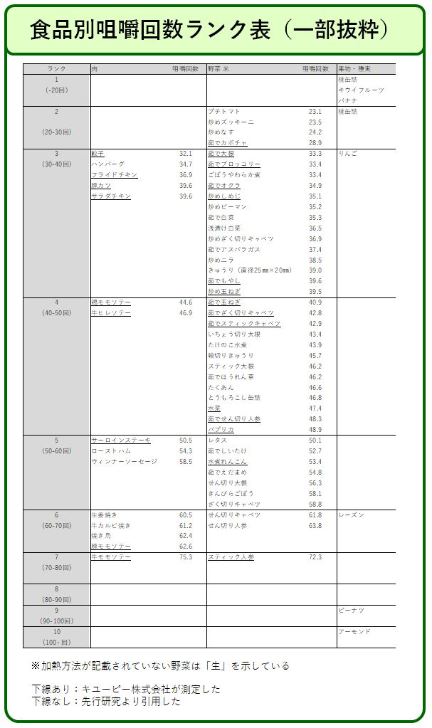 キユーピー株式会社(本社:東京都渋谷区、代表取締役 社長執行役員:長南 収、以下キユーピー)は、株式会社ロッテ(代表取締役社長執行役員:牛膓 栄一)と和洋女子大学(学長:岸田 宏司)の柳沢 幸江教授(大学院総合生活研究科 研究科長)らと、“噛むことの大切さ”の啓発を目的に共同研究に取り組んでいます。今回、60品目に及ぶ食品の咀嚼回数を測定し、既存の55品目に加えて計115品目の「食品別咀嚼回数ランク表」を作成しました(表1参照)。加えて、水分量や加熱が咀嚼回数に与える影響や、咀嚼回数の多い食品群を明らかにし、これらの研究成果について、2021年10月2日(土)~29日(金)にWEB開催される「特定非営利活動法人 日本咀嚼学会 第32回学術大会※1」にてポスター発表を行います。