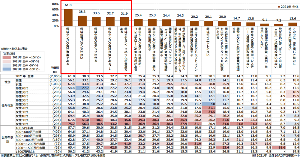 - 卵について魅力を感じることは、「タンパク質が豊富」が突出