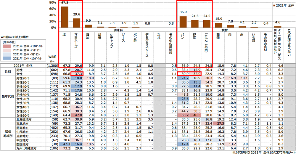 性別で見ると、女性は男性に比べ「塩」「胡椒」「パン」「野菜」と一緒に目玉焼きを食べる人が多いことが分かりました(資料4)。