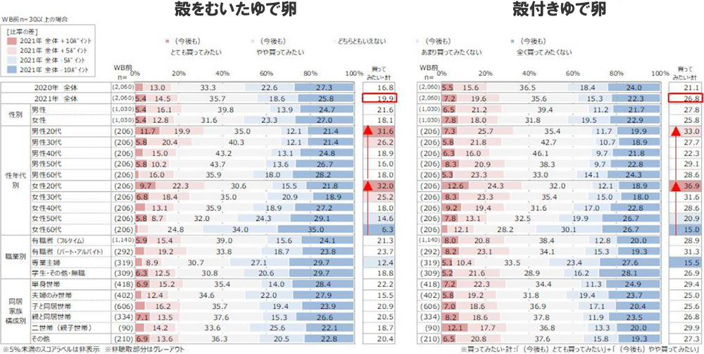 - 「殻付き・殻むきゆで卵」に対する購入意向が大きく上昇