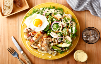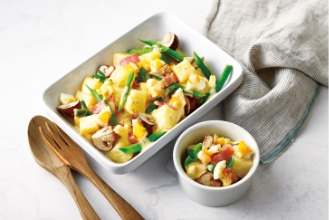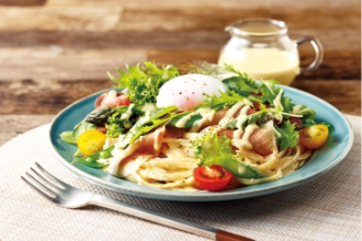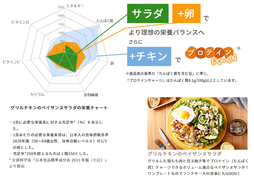 「ペイザンヌサラダ」は、卵、野菜、じゃがいも、マッシュルームなどを盛り合わせた“田舎風”のサラダです。「ペイザンヌサラダ」の魅力はいろいろありますが、その一つに栄養バランスの良さがあります。ベースのサラダに、卵をトッピングすることで、野菜だけでは不足していたタンパク質をプラスでき、見栄えもよくなります。ハムやベーコン、グリルチキンなどを加えれば、さらにタンパク質量がアップし、ボリュームのあるワンプレートメニューとして提供できます。