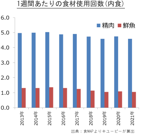 キユーピーが『旬のやさかなレシピ』推進プロジェクトを始動する背景には、日本における魚の生産量や購入量の減少があります。魚料理への好意度は高い一方(以下、左グラフ)、内食における1週間あたりの食材使用回数の調査によると、肉は週に4~5回使用されているのに対し、魚は週に1回しか食卓に上っていないという現実がうかがえます(以下、右グラフ参照)。