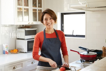 料理愛好家・平野レミの次男と結婚後、修業を重ね、食育インストラクターの資格を取得。