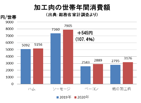 ソーセージなど朝食での使用頻度が高い加工肉は、コロナ下の外出自粛やリモートワーク増加の影響もあり、消費額が伸長しています。特にソーセージは世帯年間消費額が高く、2020年は2019年に比べて、545円増加しており、前年対比で約107%となっています。