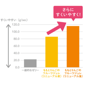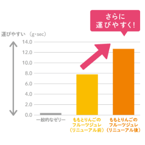 本評価法を用いて、「ももとりんごのフルーツジュレ」を測定したところ、今回のリニューアル品は、リニューアル前に比べて、さらに「すくいやすく、運びやすい」物性であることが分かりました。