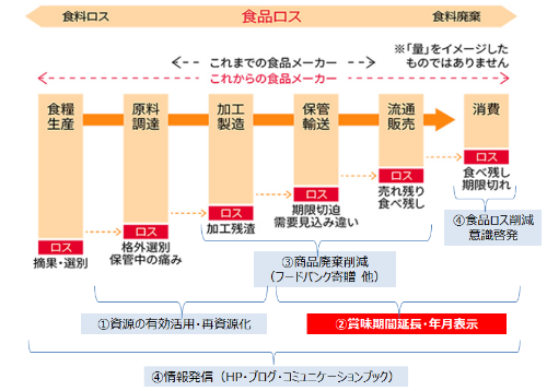 資源の有効活用・再資源化など、さまざまなアプローチを進める中、「賞味期間の延長」は、商品の製造後、保管・輸送から、流通・販売、消費までの各段階における食品ロス削減につながる取り組みです。