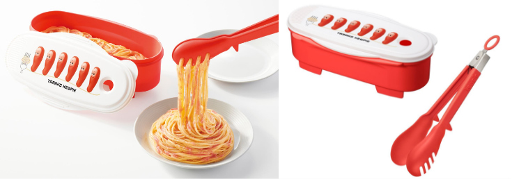 「たらこキユーピー 電子レンジパスタ調理器」と「多機能トング(たらこキユーピーシルエット)」(写真はイメージです)