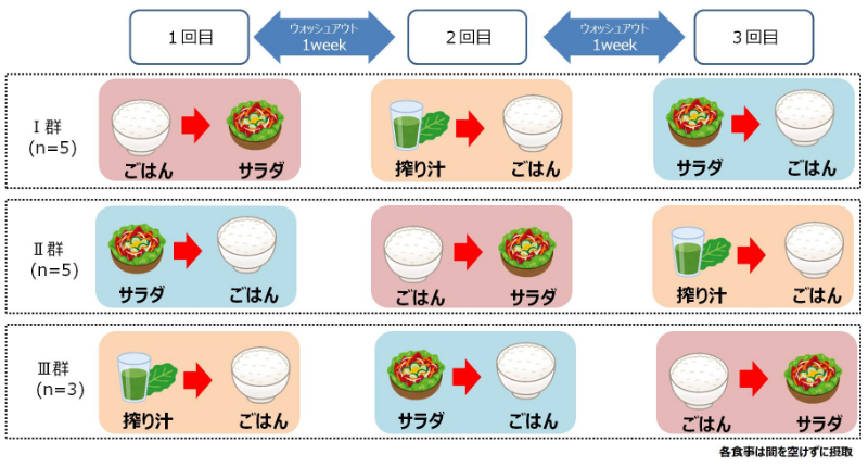 「市販のごはん」150g、「市販の野菜サラダ」(千切りキャベツをベースとしたサラダ)175g、「野菜サラダの搾り汁」220g(市販の野菜サラダ175gをミキサーで粉砕してから濾過し、水を加えて220gに調整したもの)を用意※3し、健常男性13名を対象に単回摂取クロスオーバー試験を行いました。被験者(前日に一晩絶食)を3つのグループに分け、7日間のウォッシュアウト期間を挟み、①ごはん→野菜サラダ、②野菜サラダ→ごはん、③野菜サラダの搾り汁→ごはんの3種類の食事を、それぞれパターンを変えて、①②③すべて摂取しました(図1参照)。