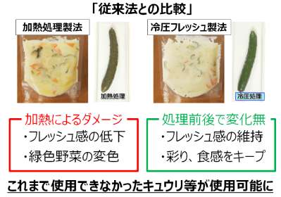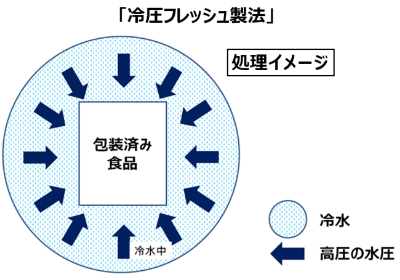 食品を低温・高圧処理することで、より素材本来の食感や色味を残し、味わいを維持しながら日持ちを延長できる当社独自の技術です。