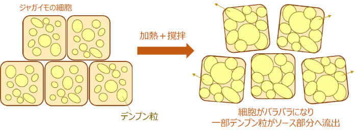 研究の結果、じゃがいもを蒸した後に粗熱を取って(40℃)、適度に撹拌すると、ソース部分へデンプンが程よく分散することが分かりました。