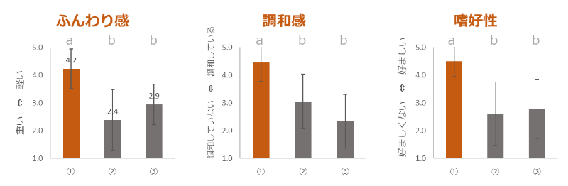 顕微鏡観察の結果、撹拌条件によって、ソース部分へのデンプンの流出度合いに差がみられました(図1)。また、官能評価の結果から①のサンプルは食感がふんわりし、味の調和感が高く、嗜好性も高いことが分かりました(グラフ1)。これは、温かいほどじゃがいもの細胞が崩れてソース中にデンプン粒が流出しやすくなり、マヨネーズソースとデンプン粒が混ざり合うことで物性が変化するためだと考えられます。