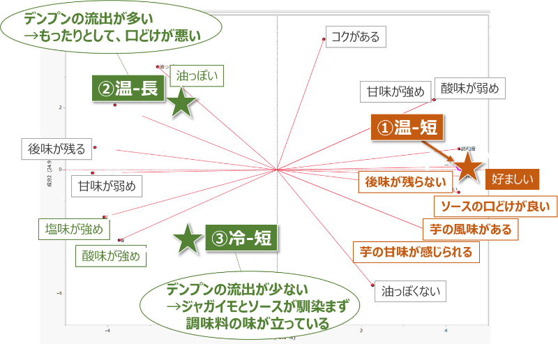 ①は、じゃがいもの風味が感じられてソースの口どけが良く、調和感があるという評価でした。一方で、②はソースの口どけが悪く、油っぽい評価であり、③は酸味や塩味が強く、じゃがいもの風味が感じられない評価でした。これは、②はデンプンの流出が多く、ソースがもったりとする一方で、③はデンプンの流出が少なく、じゃがいもとマヨネーズソースが馴染まず、味がバラバラと感じられるためだと考えられます。