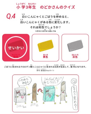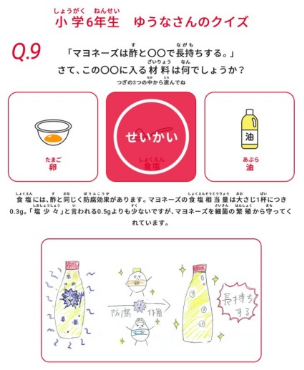 応募の中から14作品が受賞しました。受賞したクイズを主催者側で三択クイズに編集し、『食生活アカデミー』コンテンツ内の「ふむふむ、なるほど、食生活クイズ」として公開します。クイズの回答を三択から一つ選び、正解すると解説が表示されます。解説では、応募用紙に書かれたイラストを採用し、受賞者一人一人のオリジナルクイズとなっています。