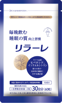 「リラーレ」は、「メラトニン」を増やす働きを持つ、ラフマ葉抽出物を配合した機能性表示食品(サプリメント)です。ラフマ由来ヒペロシド、ラフマ由来イソクエルシトリンには、睡眠の質(眠りの深さ・起床時の睡眠に対する満足感)の向上に役立つことが報告されています。