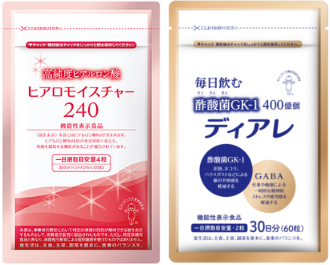 写真㊧「ヒアロモイスチャー240」(機能性関与成分:ヒアルロン酸Na)、写真㊨「ディアレ」(機能性関与成分:酢酸菌GK-1)