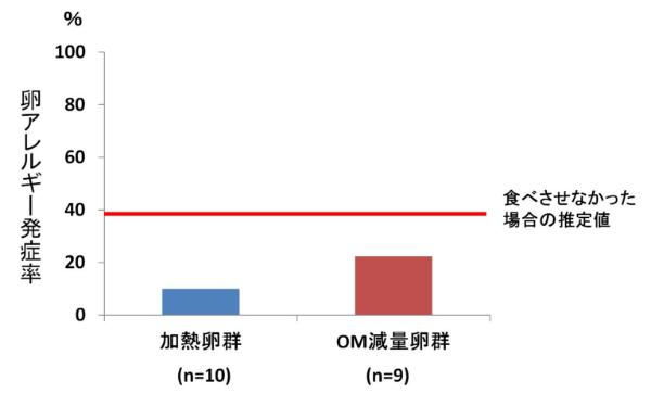 症例数は少ないですが、結果は、低アレルゲン化処理した卵製品でも、加熱全卵と同様に鶏卵アレルギーの発症を予防できる可能性が示唆されました。