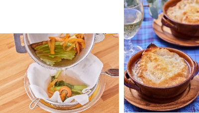 本来捨ててしまう玉ねぎの皮やキャベツの外葉などの野菜くずを、オニオングラタンスープのだしとして活用するレシピを紹介します。