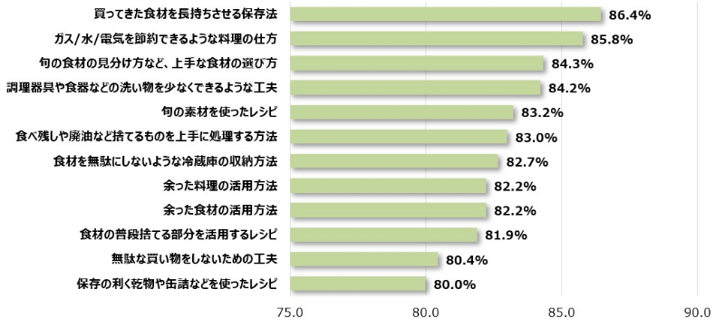 「キユーピー3分クッキング プラスエコ」プロジェクトスタートに先立ち行った調査で、7割以上(73.6%)の人が「現在エコに関心がある(あてはまる/ややあてはまるの合計)」(グラフ1)と回答しています。さらに、「普段のお料理の中で、エコに対してできる行動や工夫として知りたいこと」を尋ねたところ、「買ってきた食材を長持ちさせる保存法(86.4%)」、「ガス/水/電気を節約できるような料理の仕方(85.8%)」、「旬の食材の見分け方など、上手な食材の選び方(84.3%)」など、いずれも8割以上の人が、さまざまな工夫を知りたいと回答しています(グラフ2)。