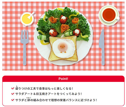 『食生活アカデミー』のターゲットである小学校高学年から中学生は、成長が著しく活動量も多いため、食事をしっかり取ることが大切です。今回新たに提案するサラダと目玉焼きの『食べるアート』は、目で楽しむだけでなく、同サイト内の「6つの基礎食品群でバランスのよい食事を考えてみよう!」を活用して、栄養バランスを考えながら作ることもおすすめです。