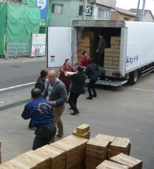 2011年東日本大震災発生後、「やさしい献立」を含めた支援物資を従業員が運び出す様子