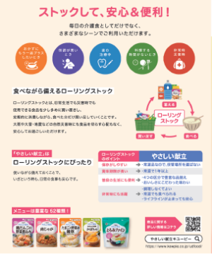 防災グッズと「やさしい献立」のセット販売を提案したり、ローリングストックについて解説したリーフレットをおむつなどの介護用品に添付したりと、さまざまな方法で備えに対する啓発活動を実施しています。リーフレットの制作は、東日本大震災を経験したキユーピーの従業員が担当し、当時の教訓を基にローリングストックのポイントを分かりやすくまとめています。「やさしい献立」公式サイトでも、ローリングストックの情報を公開しています。
