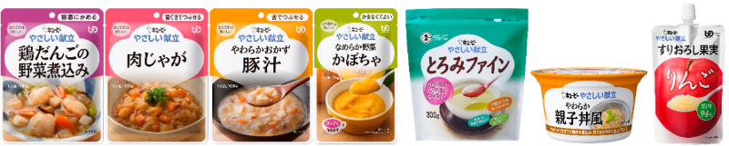 ※1 日常の食事から介護食まで幅広く使える、食べやすさに配慮した食品。かたさや粘度に応じて、日本介護食品協議会により制定された4区分(容易にかめる・歯ぐきでつぶせる・舌でつぶせる・かまなくてよい)と、とろみ調整で構成。
