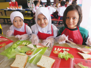 マレーシアは東南アジアの中でも肥満率が高く、糖尿病などの生活習慣病が国の健康課題となっています。このような背景から、キユーピーマレーシアでは、2017年より小学生を対象にした出前授業「サンドイッチ教室」を継続的に開催しています。野菜を使ったサンドイッチ作り体験を通して、子どもたちが楽しみながら朝食や野菜摂取の大切さを学べるよう工夫しています。