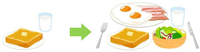 平日の朝食(左)を栄養バランスの良い献立にしたアイデア例(右)