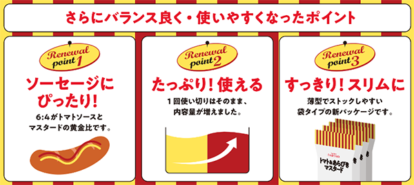 そこで、今回のリニューアルでは、Sサイズの容器からMサイズの容器へ変更し、1回分の使用量を増やしました。さらにトマトソースとあらびきマスタードの割合を6:4(現行品は5:5)に変更しました。また6個入りから4個入りにすることで、箱タイプから袋タイプになりストックしやすいスリムなパッケージになりました。