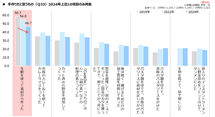 これらの変化は、調理の簡便化や外部化の進行に加え、現代のライフスタイルの変化や時間効率を重視する傾向を反映していると考えられます。