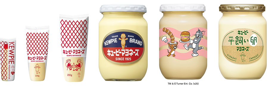 左から順にキユーピー マヨネーズ50g、130g、200g、キユーピー マヨネーズ(瓶)、キユーピー マヨネーズ・トムとジェリー(瓶)、キユーピー 平飼い卵マヨネーズ