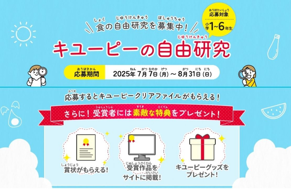 キユーピー株式会社(本社:東京都渋谷区、代表取締役 社長執行役員:髙宮 満、以下キユーピー)は、キユーピー公式サイト内の食育コンテンツ『食生活アカデミー』で7月7日(月)から、小学生を対象とした食に関する自由研究の募集を開始します。
