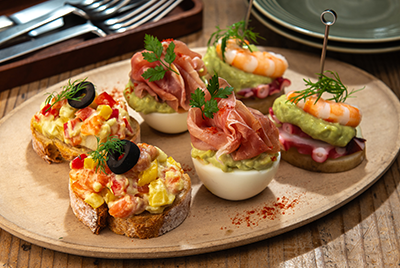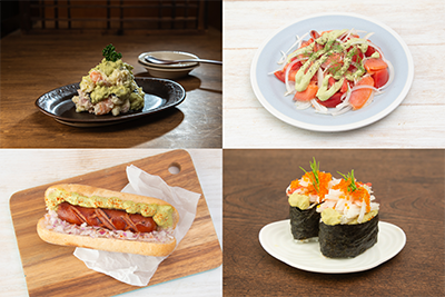 本商品は、既存商品の「キユーピー 具沢山フィリング アボカド(ワカモレ)※」に比べ、シンプルなアボカド風味に仕上げているため、汎用性の高さが魅力です。“アボカドそのもの”の代わりとして、より多様なメニューへの展開が期待できます。特に、マグロ、サーモン、えびといった魚介系の食材との相性がよく、クリーミィな食感が魚介の風味を引き立てます。ピンチョスやポテトサラダなどの外食メニュー、バーガーやサンド、寿司、パスタなど、幅広いジャンルのメニューに活用できます。