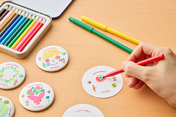 お皿に見立てた紙にオリジナルサラダを自由に描いて缶バッジが作れます。数に限りがあります。