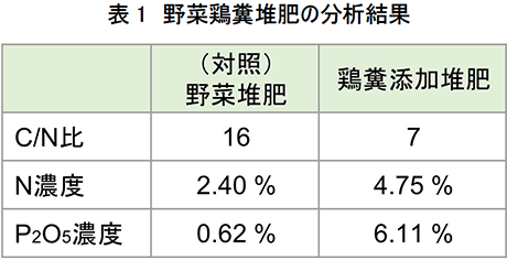 - 野菜鶏糞堆肥は、野菜だけの堆肥に比べて窒素やリン酸など肥料成分の濃度が高いことが分かりました。