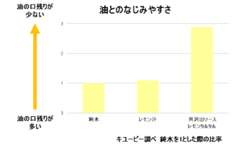 キユーピーの調査では「具沢山ソース レモンタルタル」とレモン汁を比較したところ、レモンタルタルの方が、口の中で油となじみやすいため、油の口残りが少ないことが分かりました。これにより、揚げ物などの油分の多い料理と合わせた際に、レモン汁だけをかけるよりも、よりさっぱりと食べられることが示唆されています(グラフ参照)。