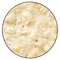 市場ニーズに対応するため、レモン果汁とレモン果皮を使用し、爽やかなレモン風味と香り立ちの良いタルタルソースを開発しました。手作りのようなシャキシャキとしたたまねぎの食感と、ごろごろとした具材感が、まるで作り立てのようなおいしさを演出します。また、ソースが食材の上に適度にとどまるよう、作業性の良い粘度を実現しました。