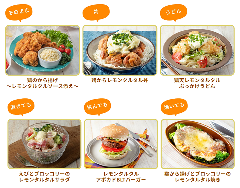 市販用タルタルソース市場の拡大に合わせ、夏場など暑さで食欲が落ちる季節にも爽やかに食べられる商品として、から揚げなどの揚げ物だけでなく、サラダやサンドイッチなど幅広いメニューにご活用いただいています。
