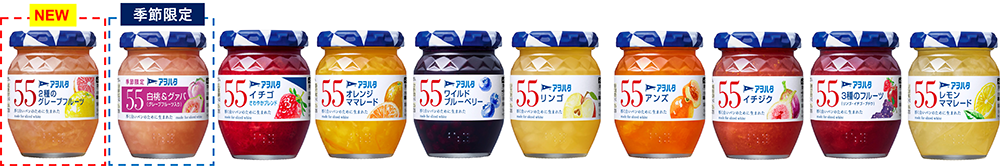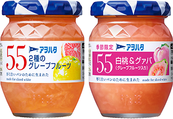 「アヲハタ 55」シリーズは、1970年の発売以来パンの最高の相棒をめざして進化を続けています。今回は、さわやかな柑橘系のフレーバーが人気であることから、新たなラインアップとして「2種のグレープフルーツ」が誕生しました。また人気のフルーツを組み合わせた「白桃&グァバ(グレープフルーツ入り)」を季節限定品として発売します。